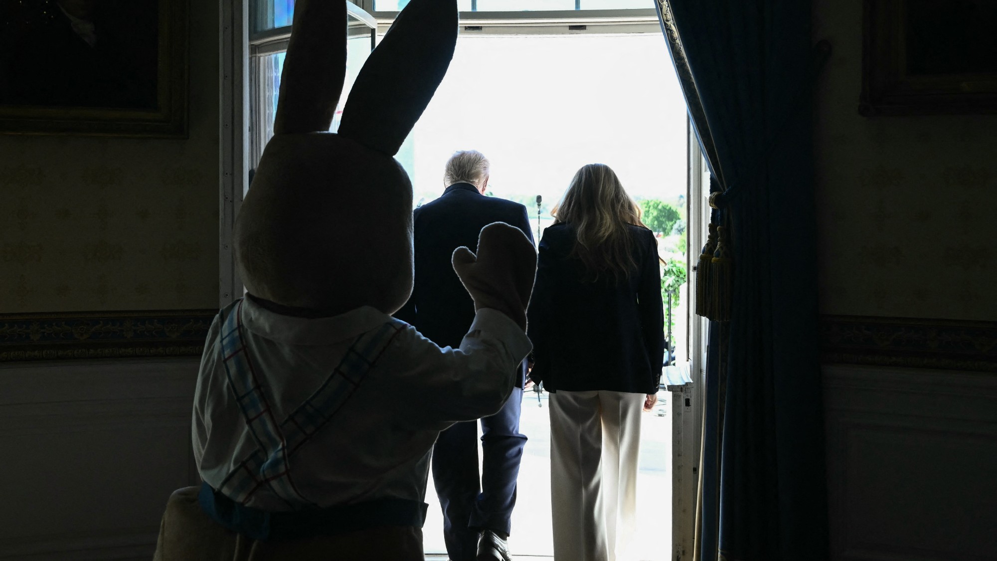 The president and first lady walk from the Blue Room to the balcony followed by a costumed Easter bunny during the annual Easter Egg Roll at the White House. Trump used his Easter speech today to give an update on the Iran war.