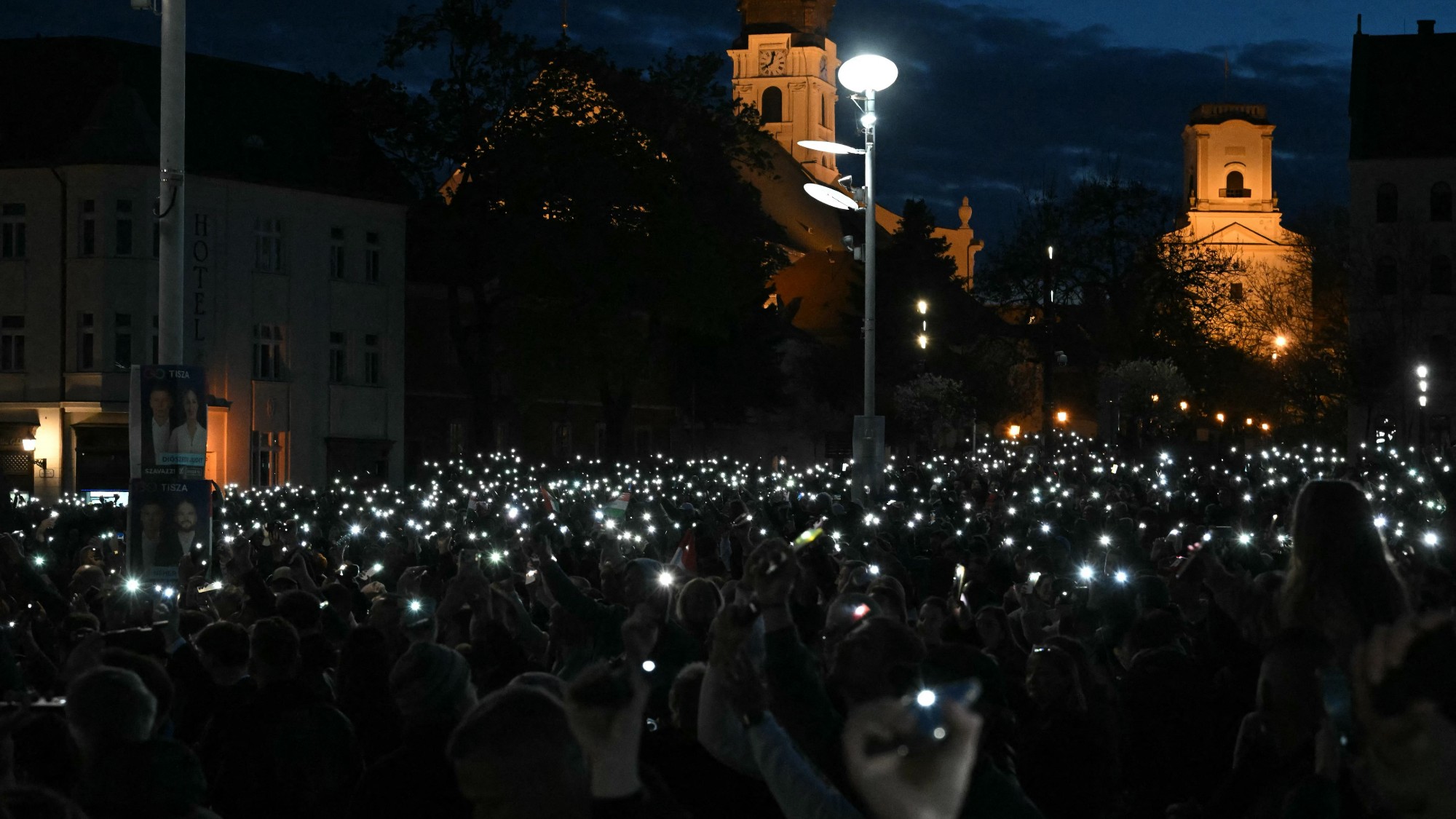 People light their phones as Hungarian opposition leader, head of the Tisza Party and candidate for prime minister Péter Magyar addresses supporters at a campaign rally in Gyor. He’s ahead in the polls for the country’s election on Sunday and may oust Viktor Orbán after 16 years in power.