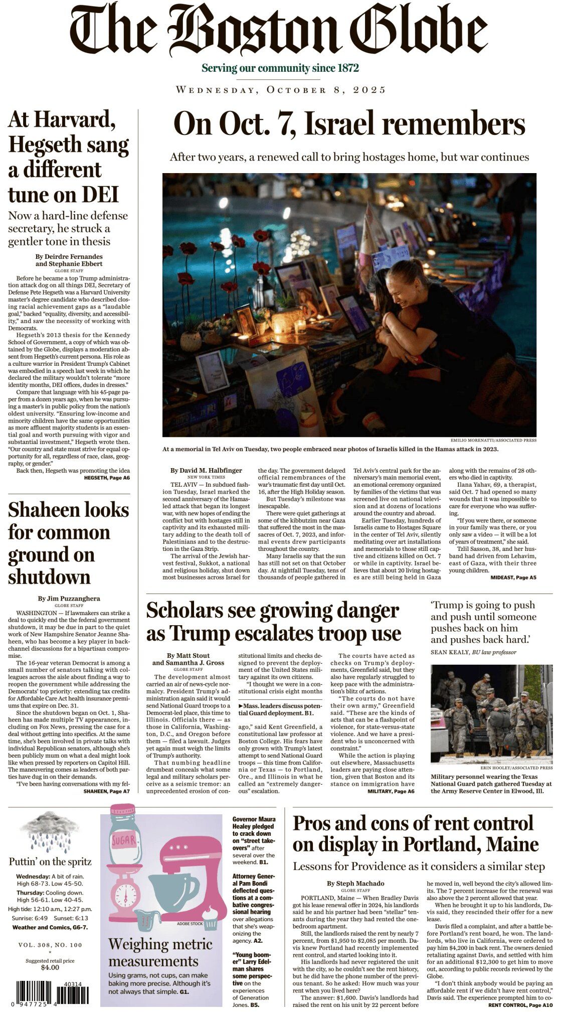 “On Oct. 7, Israel remembers,” The Boston Globe says on Wednesday’s front page. “Two years later, worlds shattered in Israel, Gaza,” the Los Angeles Times says. In the U.S., “justices are skeptical of bans on LGBTQ ‘conversion therapy,’” The Wall Street Journal says. “Texas National Guard arrives,” the Chicago Tribune says. Those “boots on the ground” are at a “facility in far southwest suburban Elwood,” the Chicago Sun-Times says. “ICE detention oversight office closed during shutdown,” says The Washington Post. “Back pay not assured for federal employees,” according to “new White House memo,” The Atlanta Journal-Constitution says. “Trump’s tariffs may fuel ’26 midterms,” says USA Today.