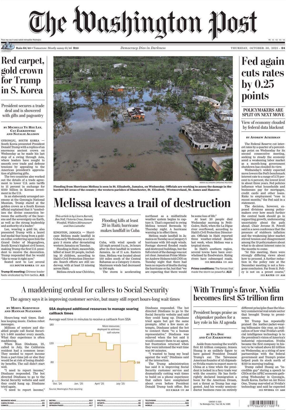 “3 islands left partly crippled by hurricane,” The New York Times says on Thursday’s front page. “‘Catastrophic’ hit kills at least 27,” says the Miami Herald. “Caribbean begins work of rebuilding,” The Atlanta Journal-Constitution says. “With Trump’s favor, Nvidia becomes first $5 trillion firm,” The Washington Post says. “Fed cuts rates, Powell wary of more,” The Wall Street Journal says. “Rates cut to lowest level in 3 years,” but “shutdown’s data blackout complicates Fed’s task,” The Boston Globe says. Senate Republicans say “government shutdown talks have ‘picked up,’” says The Sacramento Bee. Senate Democrats slam “the ‘heartless’ Don” for “weaponizing hunger” in shutdown battles, says the New York Daily News.
