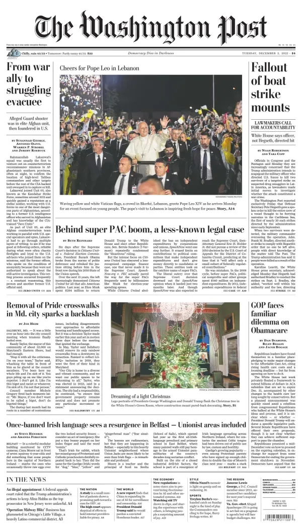 “Pope Leo rallies flock in cradle of Christianity,” The Wall Street Journal says on Tuesday’s front page. “Israel targets foes at will, even in cease-fires,” The New York Times says. “Parties pulling all the stops in crucial” special congressional race, The Tennessean says. “Midterms may hold the cards for Vance,” says USA Today. “GOP unveils proposed new map” that could erase Indiana’s two Democratic House seats, The Indianapolis Star says. “Missouri AG involves ICE to halt anti-gerrymandering group,” The Kansas City Star says. “Fallout of boat strike mounts” as “lawmakers call for accountability” and “White House says officer, not Hegseth, directed hit,” The Washington Post says. “Trump, Rubio and others are using social media to sell Venezuela policy,” says the Miami Herald.