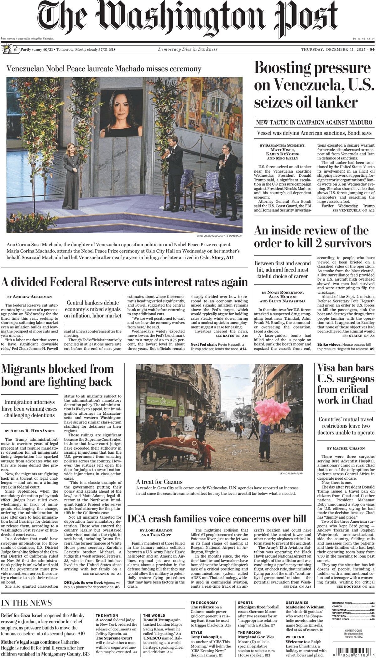 What next? The vessel seizure was a “warning to other tankers waiting to dock and load up Venezuelan crude,” The Wall Street Journal said, citing a Pentagon official. It also “came just hours after Venezuelan opposition leader María Corina Machado left the country on a boat, an escape that potentially gave the Trump administration an opening to take more aggressive action against the Maduro regime.” Machado arrived in Oslo last night, missing her Nobel Peace Prize bestowal ceremony by hours. |
