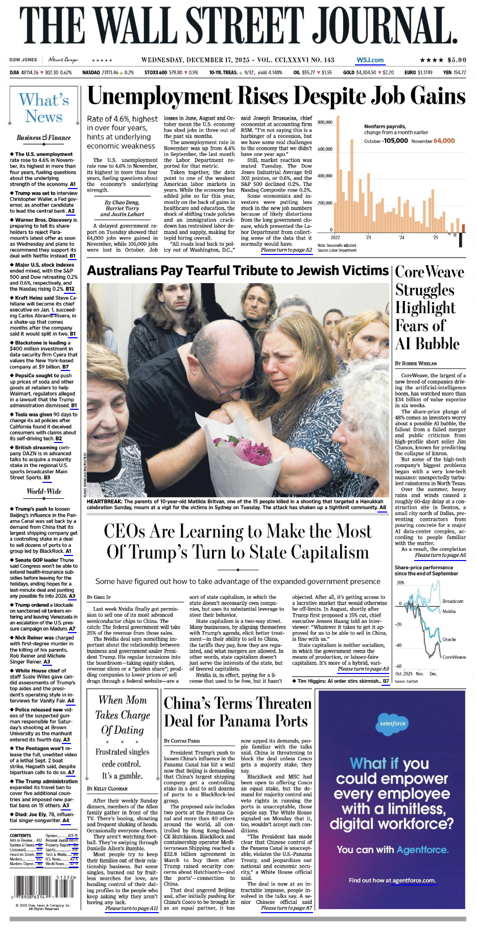 “Unemployment rises in warning for U.S. economy,” The New York Times says on Wednesday’s front page. “Trump tries to tame ire on costs,” The Washington Post says. “CEOs are learning to make the most of Trump’s turn to state capitalism,” says The Wall Street Journal. “FBI seeks leads in Brown shooting,” the Arizona Republic says. “Still no answers,” says The Boston Globe. “Reiner son faces murder charges in double slaying” and “could get the death penalty or life in prison without parole if convicted,” the Los Angeles Times says. The “Reiners’ awful struggle could be any of us” as many “families confront anguish of addiction,” says USA Today.