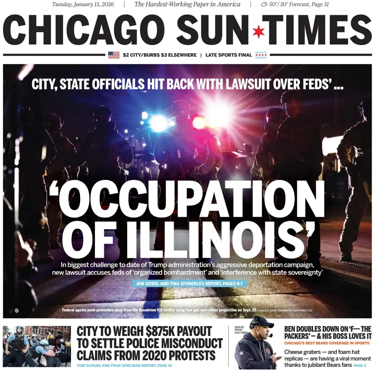 “Politics of 2026 lurching to edges,” USA Today says on Tuesday’s front page. “A defiant Fed chair stands up to White House,” the Los Angeles Times says. “Trump faces blowback as probe of Fed chief roils Washington,” The Boston Globe says. “U.S. job growth turns sluggish under Trump,” says The Atlanta Journal-Constitution. “President ramps up private criticism of Bondi” over “failed prosecutions, handling of Epstein,” The Wall Street Journal says. “Tribal leaders say ICE is detaining Natives,” The Minnesota Star Tribune says. “FBI searches for activist ties in ICE shooting,” The New York Times says. “City, state officials hit back with lawsuit over Feds ‘Occupation of Illinois,’” says the Chicago Sun-Times.