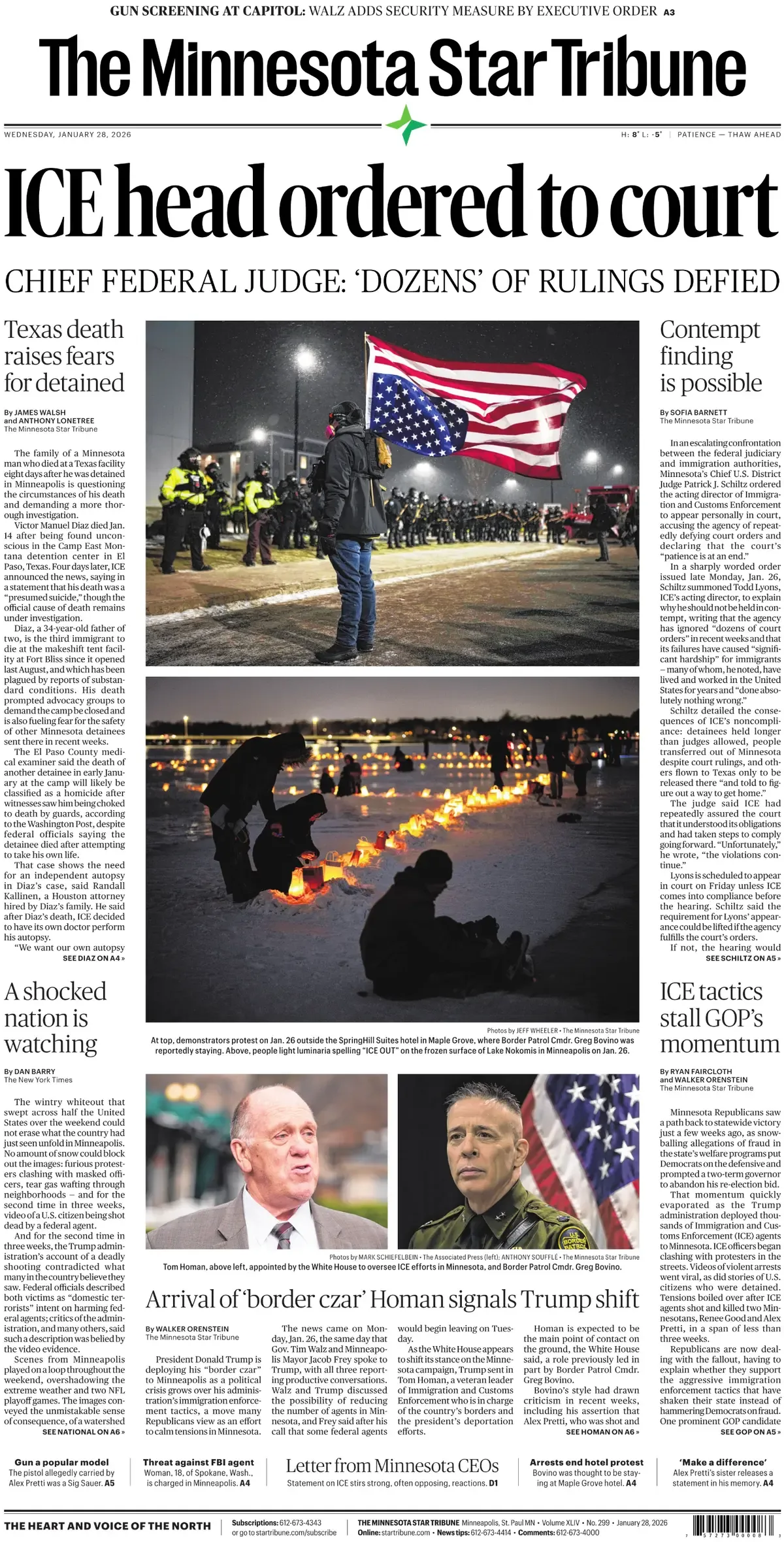 “Minnesota judge orders ICE chief to appear in person for defying orders,” the Miami Herald says on Wednesday’s front page. “Contempt finding is possible” after “‘dozens’ of rulings defied,” The Minnesota Star Tribune says. “Minnesota shooting twists U.S. gun debate,” the Chicago Tribune says. “2 officers shot guns in deadly run-in,” the Houston Chronicle says. “Federal tactics defy policing guidelines,” the Los Angeles Times says. “Trump border czar signals bid to ease tensions in Minnesota,” The Wall Street Journal says. “On immigration, GOP veers to odd place: the defensive,” The New York Times says. “Review of crash near National faults FAA,” The Washington Post says. “‘Catastrophic risks’ turn Doomsday Clock,” says USA Today.