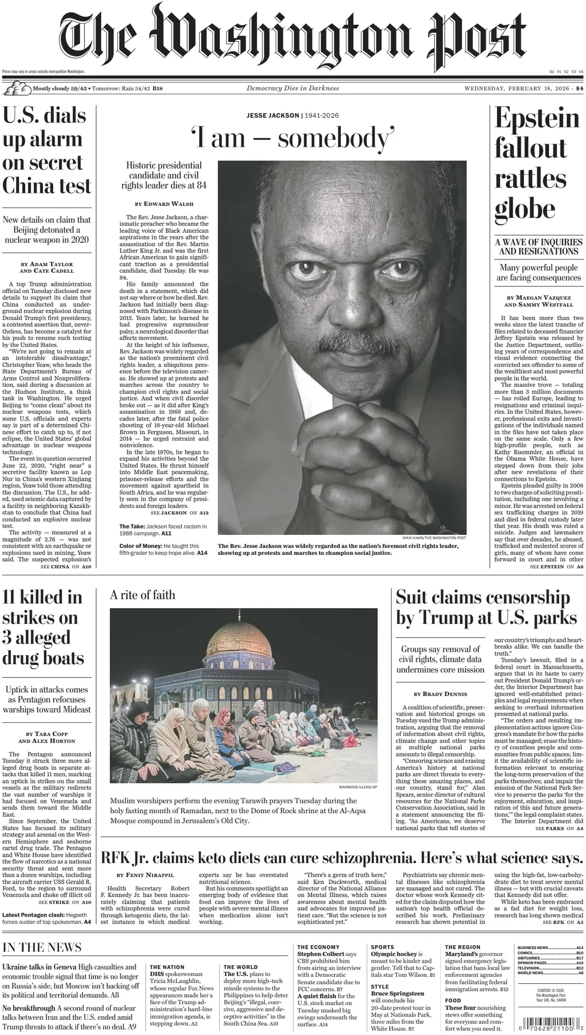 The Rev. Jesse Jackson, who died yesterday, “kept dream alive,” The Dallas Morning News says on Wednesday’s front page. “He kept hope alive, fighting for more inclusive America,” The Minnesota Star Tribune says. “He was Somebody,” says the Chicago Sun-Times. “Warner, in shift, reopens talks with Paramount,” setting “deadline for ‘best and final’ offer,” The Wall Street Journal says. “Vaccine makers curb research and shed jobs” as “Kennedy puts up obstacles,” The New York Times says. “Questions arise over payouts by FEMA,” as “officials get theirs” and others wait, USA Today says. “11 killed in strikes on 3 alleged drug boats,” The Washington Post says. “Rare overlap of Lent, Ramadan offers opportunity for learning,” says the Houston Chronicle.