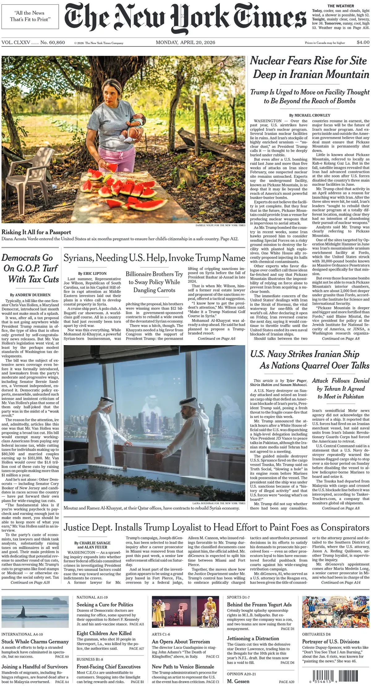 “Iran war: Distance to deal remains,” USA Today says on Monday’s front page. “Trump grapples with fears on war,” The Wall Street Journal says. “Some see biblical reason for war,” the Houston Chronicle says. “Pump pain: Gas prices may not fall until ’27,” The Atlanta Journal-Constitution says. “Pope prays at shrine in Angola that was center of slave trade,” The Philadelphia Inquirer says. “Justice Dept. installs Trump loyalist to head effort to paint foes as conspirators,” The New York Times says. “American science is rapidly shrinking,” The Washington Post says. “Phone ban in schools sought,” The Mercury News says. “Efforts to limit teens’ screen use chastised,” says The Boston Globe.