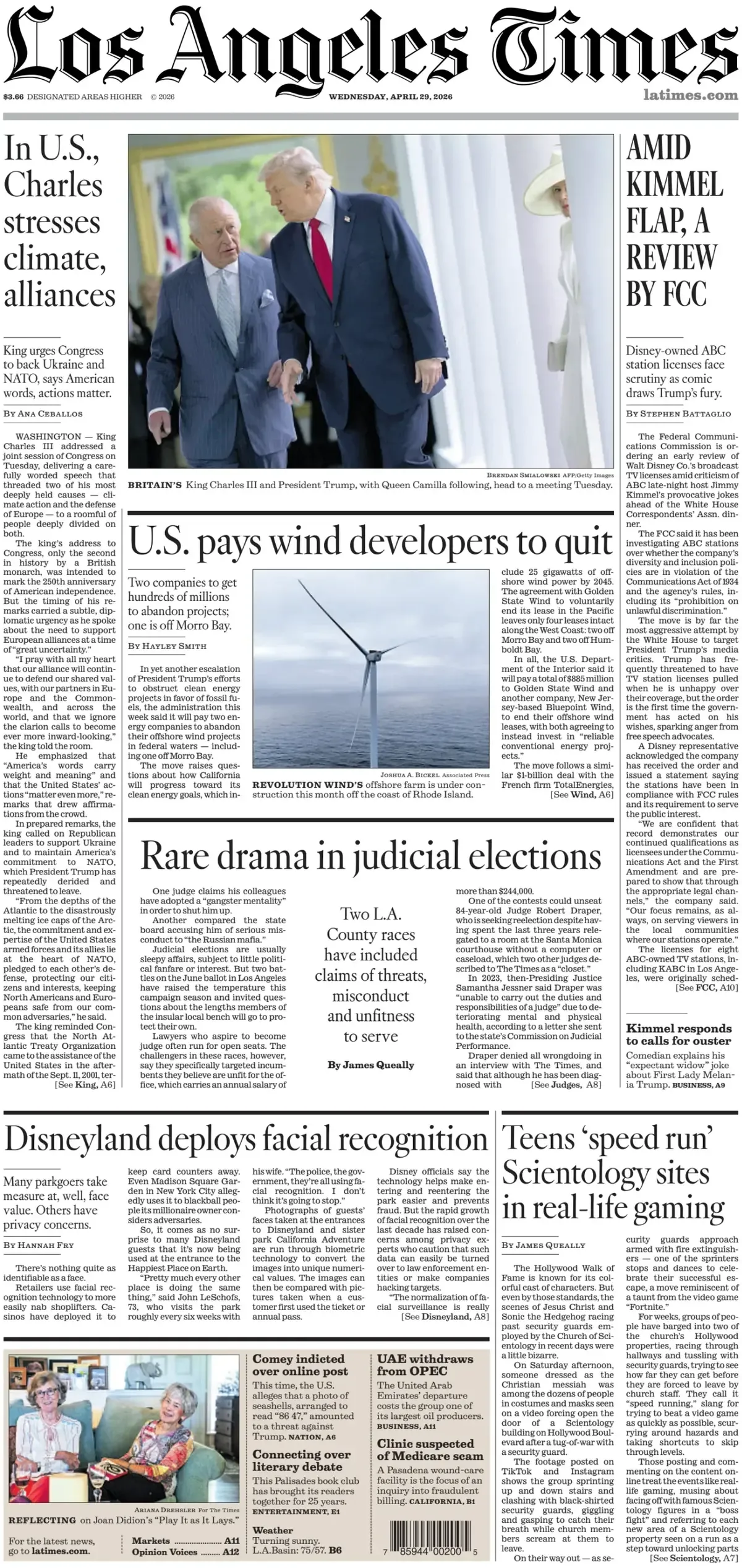 “King urges U.S. to keep special ties,” The Wall Street Journal says on Wednesday’s front page. “Americans waver on love for royalty,” says USA Today. Congress’ “GAO agrees to review DOJ’s handling of Epstein release,” The Washington Post says. “Drivers’ dread: Is $5 a gallon on the way?” the Detroit Free Press says. “U.S. pays wind developers to quit,” the Los Angeles Times says. “FCC eyes Disney’s licences after joke by Kimmel,” The Philadelphia Inquirer says. “Justices to debate merits of a migrant safety net” amid Trump’s “latest effort” to “end a pathway into the U.S.,” The New York Times says.  Elon Musk “on stand as OpenAI trial starts,” says the San Francisco Chronicle.