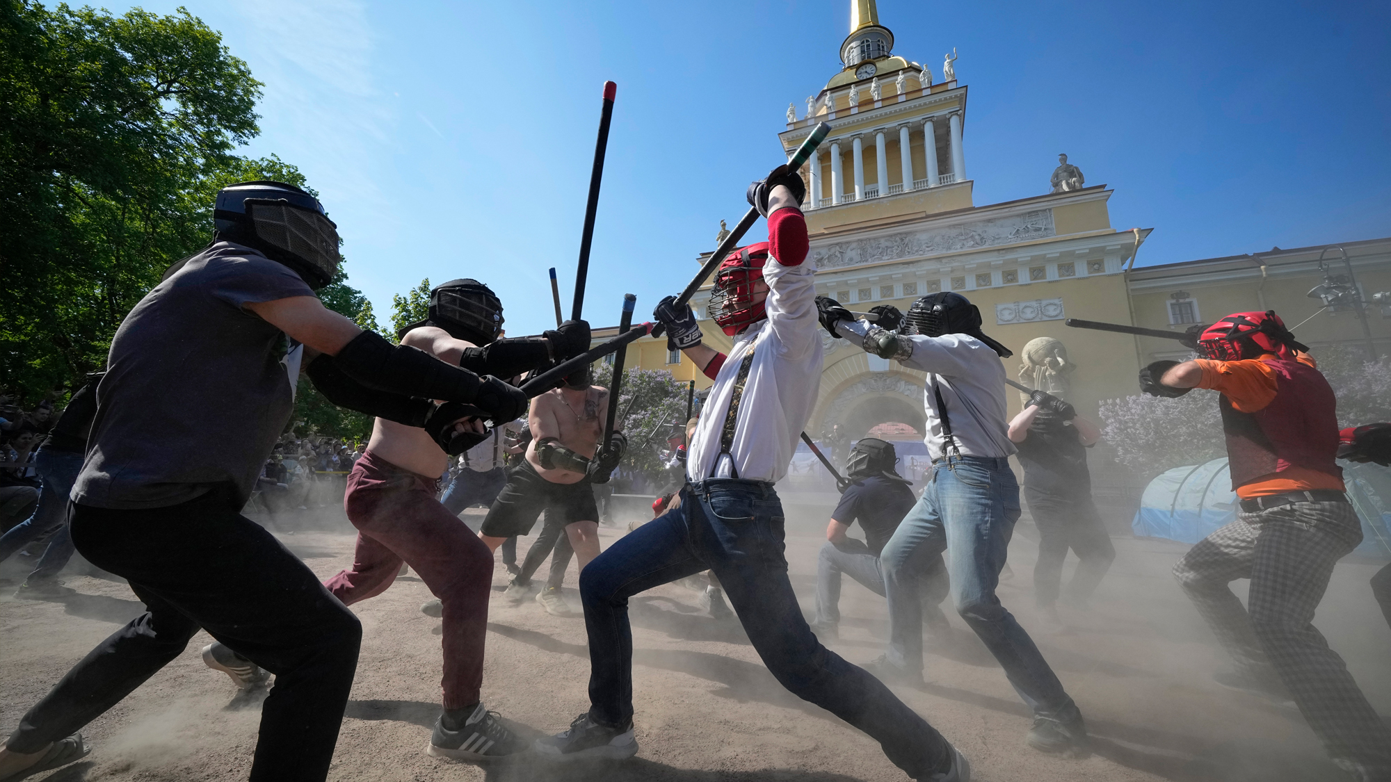 Members of an Irish stick fighting club participate in a fencing show in St. Petersburg, Russia