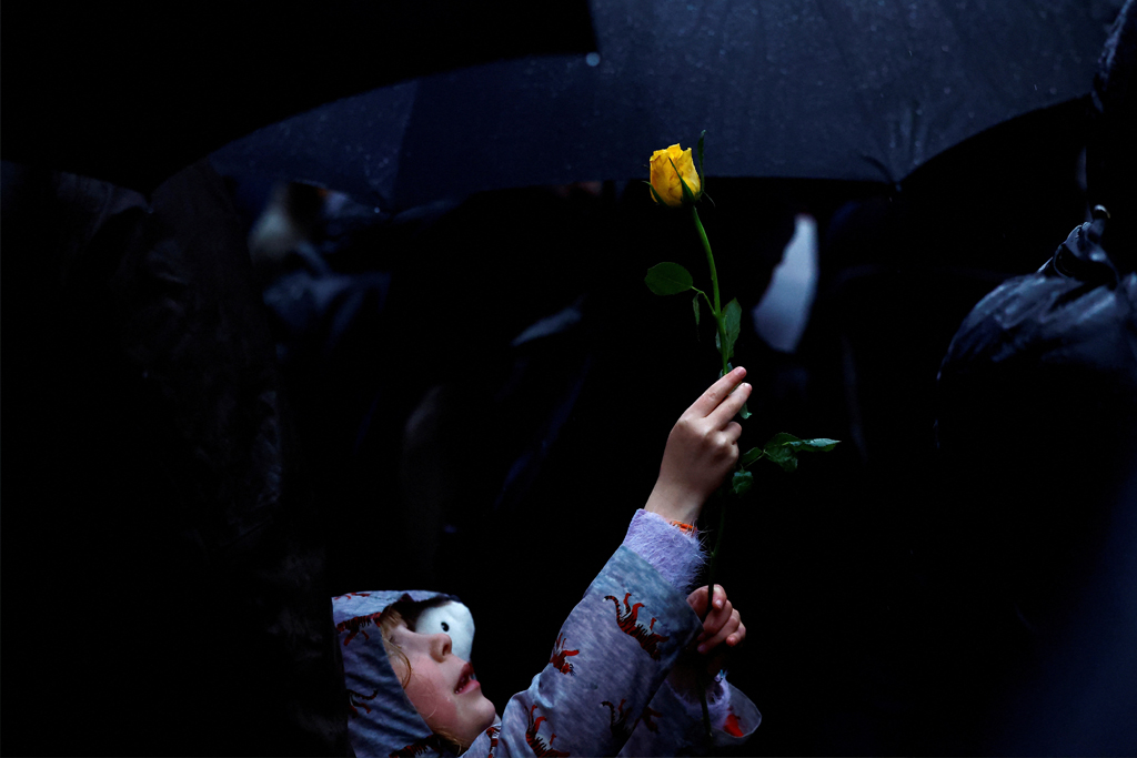 A child holds up a flower during a vigil in solidarity with Palestinians in London