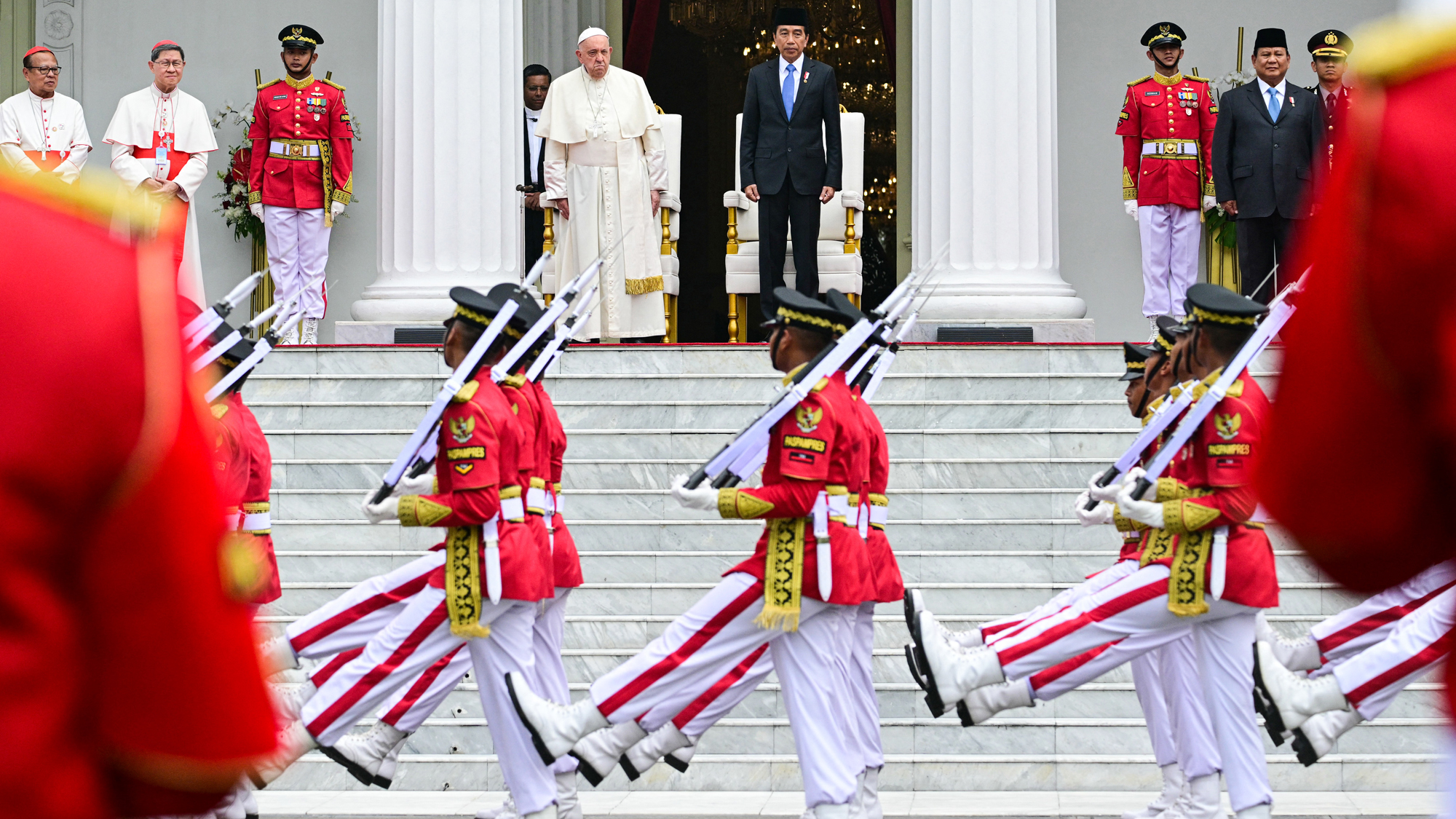 Pope Francis and Indonesian President Joko Widodo watch as the honor guard marches by during a ceremonial welcome in Jakarta