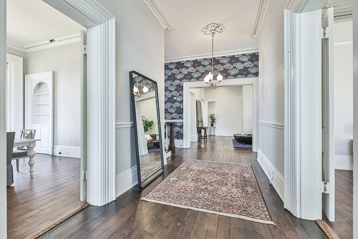 The French Colonial–inspired Shaw House stands in a leafy neighborhood 15 minutes' drive from downtown Cincinnati. Built in 1856, the renovated four-bedroom home has 12-foot ceilings with medallions and crown molding, built-ins, decorative fireplaces, and original wood floors; a new chef's kitchen; an adjacent dining area with drinks refrigerator; and a second-floor balcony overlooking a green front yard.