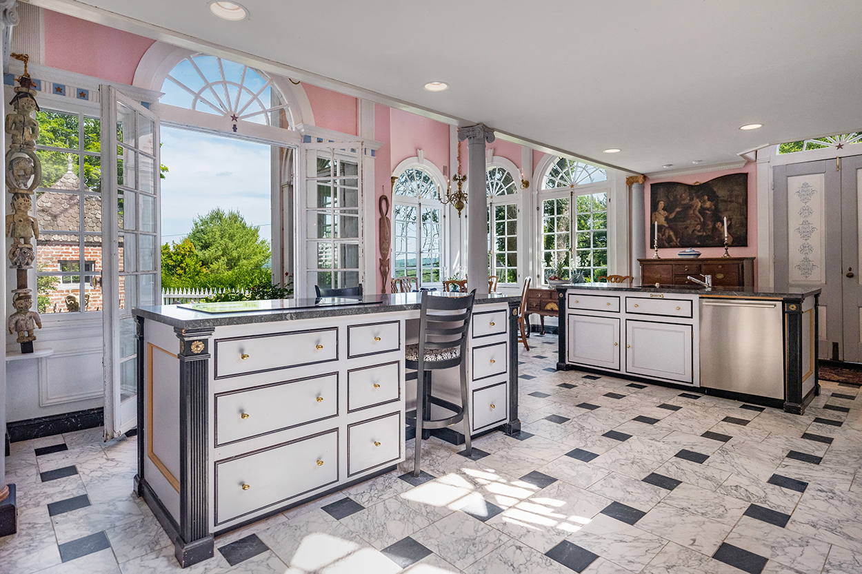 Two circa-1760 houses make up this pastel-painted five-bedroom home: the site's original gambrel Colonial and a center-chimney Colonial moved from a town nearby. The house has antique details, a library, a tavern, a music room, and a connecting eat-in kitchen building with double-height ceiling, marble floors, arched windows, and French doors.