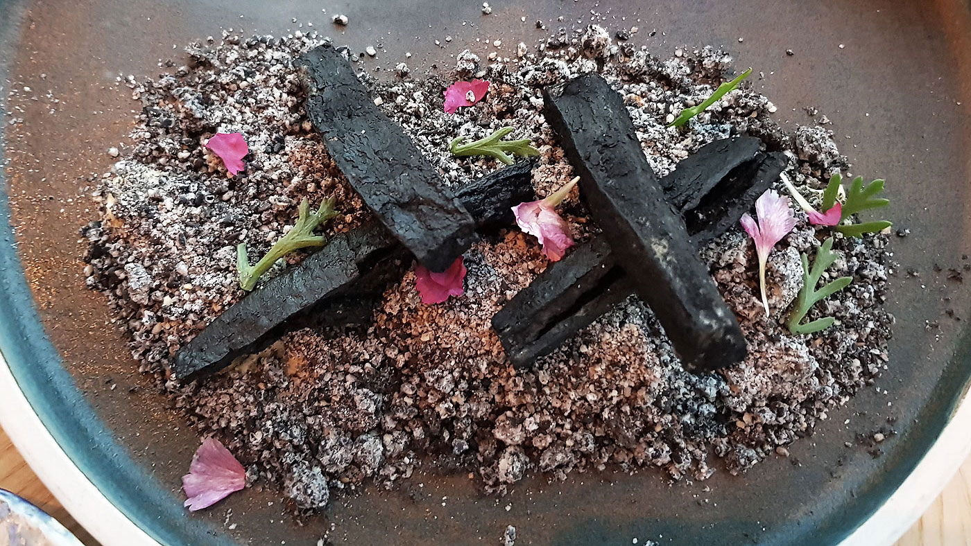 The centrepiece is several charred planks of yuca, the root from which we derive tapioca. That may explain why it remains quite bland even when blackened beyond recognition. What lifts it, apart from its startling appearance, is the ash-like bed of “smoke emulsion”, which has the texture of panko breadcrumbs and the smokey-sweet flavour of barbecued ribs. Stirred up with a dollop of creamed sweet potato, it brings crunch and punch to the yuca shards. They’re still less delicious than the beef gyoza, but they win hands-down on style.