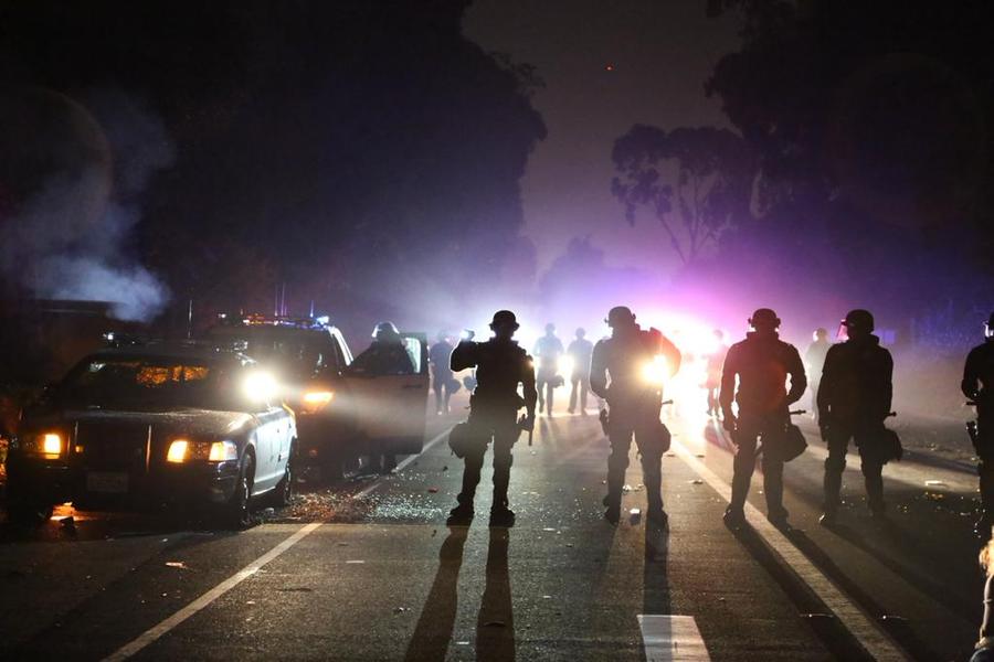 In Oakland, protesters attempted to block a highway, the Los Angeles Times reports, and when California Highway Patrol officers tried to get them back to the street, an explosive was thrown and two patrol cars vandalized. The officers used tear gas; one arrest was made.
