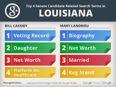 Yes, "keg stand" refers to the spat between Sen. Landrieu and her Republican opponent, Rep. Bill Cassidy, who slammed her for aiding a partier in a keg stand outside a Louisiana State University football game. Other interesting top searches? "chicken dance," (No. 2 for Iowa Democrat for Senate Bruce Braley), "fired from trek" (No. 1 for Democratic Wisconsin gubernatorial candidate Mary Burke), and "centerfold" (No. 3 for New Hampshire Republican for Senate Scott Brown).