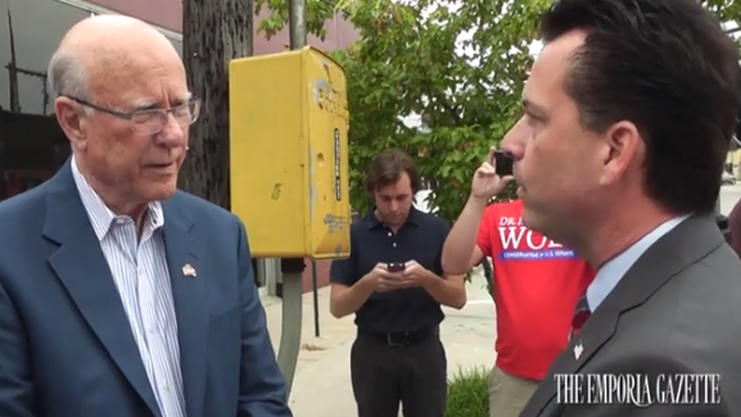Sen. Pat Roberts' Republican primary challenger confronts him during campaign stop, challenges him to debate