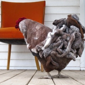 In a world "overrun by steel and glass," we all can feel alienated from nature. Though Kansas artist Sally Jane Ebright may not be able to cure modern ennui, her chicken footstools (from $650) "offer a rustic but rich, zoomorphic alternative to the traditional ottoman." Inspired by François-Xavier Lalanne's sheep ottomans and Ebright's pet chickens, each bird has cast-bronze feet, a solid oak body, and feathers upholstered from hand-felted alpaca wool. Ebright and her crew labor for about a week on each chicken. Source: CoolHunting.com