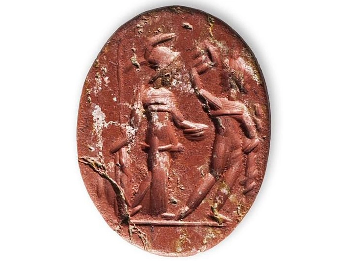 After the metal detectorist noted the find, experts from Oxford Archaeology unearthed the bronze handle, along with a cremation casket and even the remains of food and drink, during an excavation in October. The excavation also revealed a red jasper intaglio ring depicting Minerva and Mercury. The bronze handle and decorated cup are the most important finds from the site, the archaeologists noted.