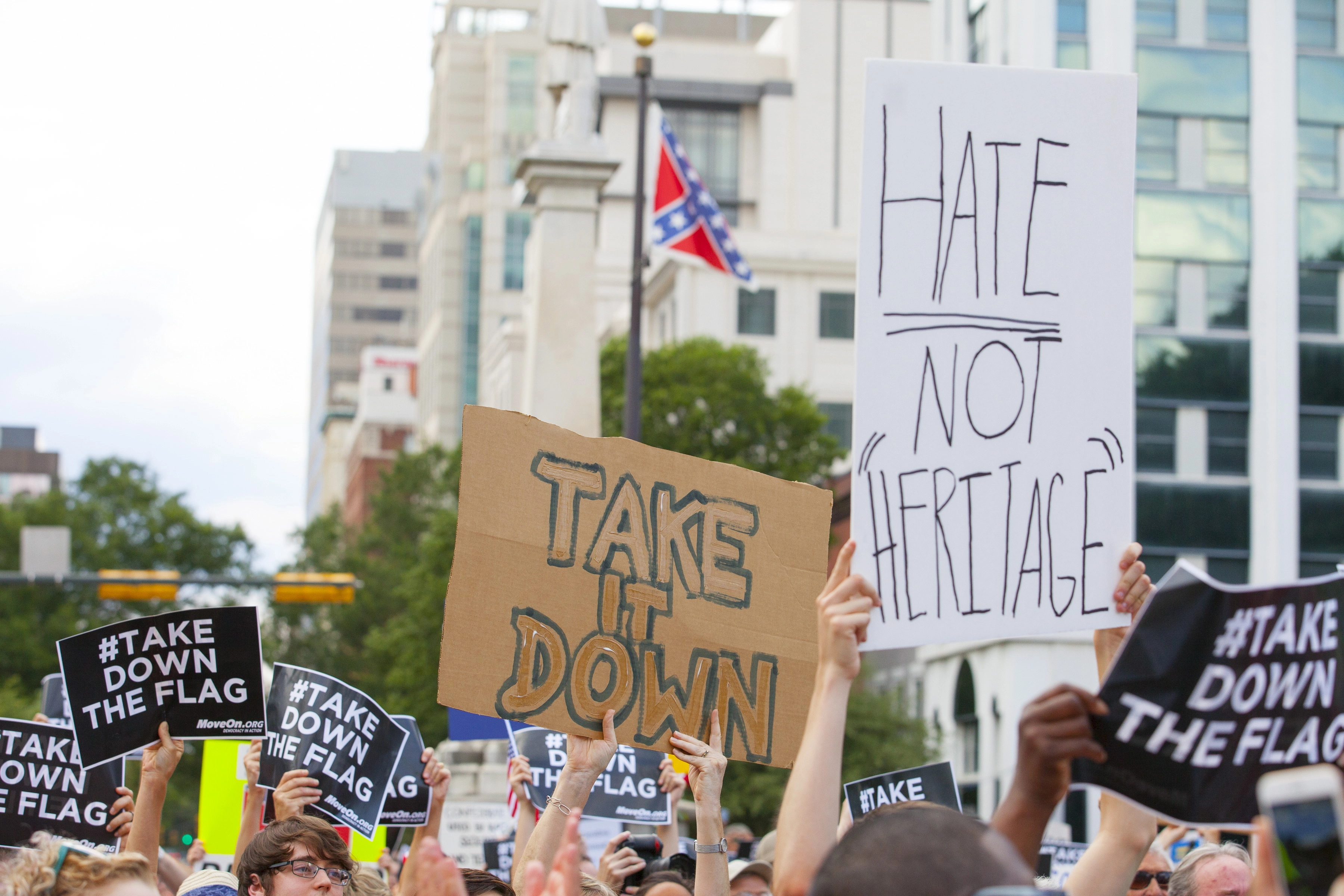 The protest follows a Wednesday night shooting in Charleston on a historically black church that killed nine people. Suspected gunman Dylann Roof reportedly posted a white supremacist manifesto on a website registered in his name.