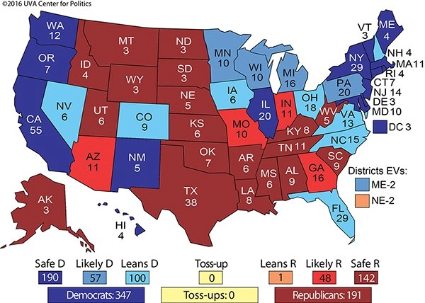 Last May, Sabato and his team at the University of Virginia created a generic Democrat-versus-Republican map that predicted a close election, but now that Clinton and Trump are the likely nominees, they adjusted the map accordingly. The new map "does not show a close and competitive general election," write Sabato, Kyle Kondik, and Geoffrey Skelley.
