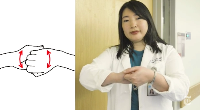 Step One: Rub palms together.Step Two: Rub each palm front to back over the back of the other hand, interlacing fingers.Step Three: Twist palms with fingers interlaced, and rub between fingers.Step Four: Interlock your fingers, (thumbs should be on opposite sides), and twist again, this time, backs of fingers against palms.Step Five: Clasp your left thumb in your right hand and move thumb in circular motion — then switch thumbs.Step Six: (Still with us?) Press your right fingers together and rub them in a circular motion on your left palm, then switch. You're done! [The New York Times]