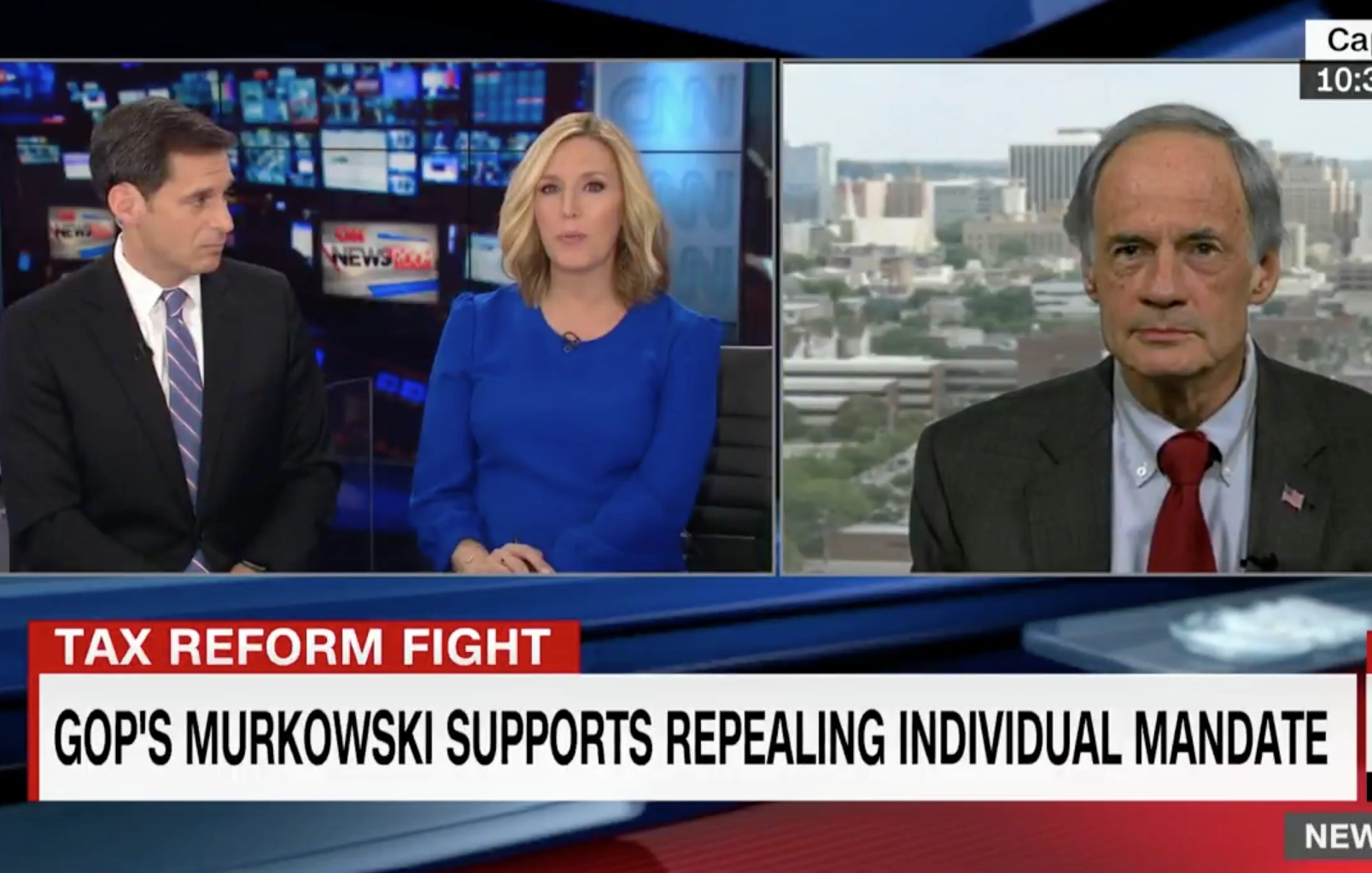 CNN's John Berman held back laughter as he asked if Carper actually convinced Cohn to fake a bad connection. The senator replied, "I don't want to throw [Cohn] under the bus, but yes." Berman's co-host Poppy Harlow then quipped, "I think you just did."