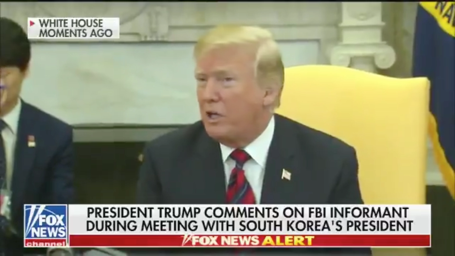 President Trump said it would be "a disgrace" for the United States if there were "spies in my campaign" in remarks Tuesday following a Monday meeting with FBI Director Christopher Wray and Deputy Attorney General Rod Rosenstein.