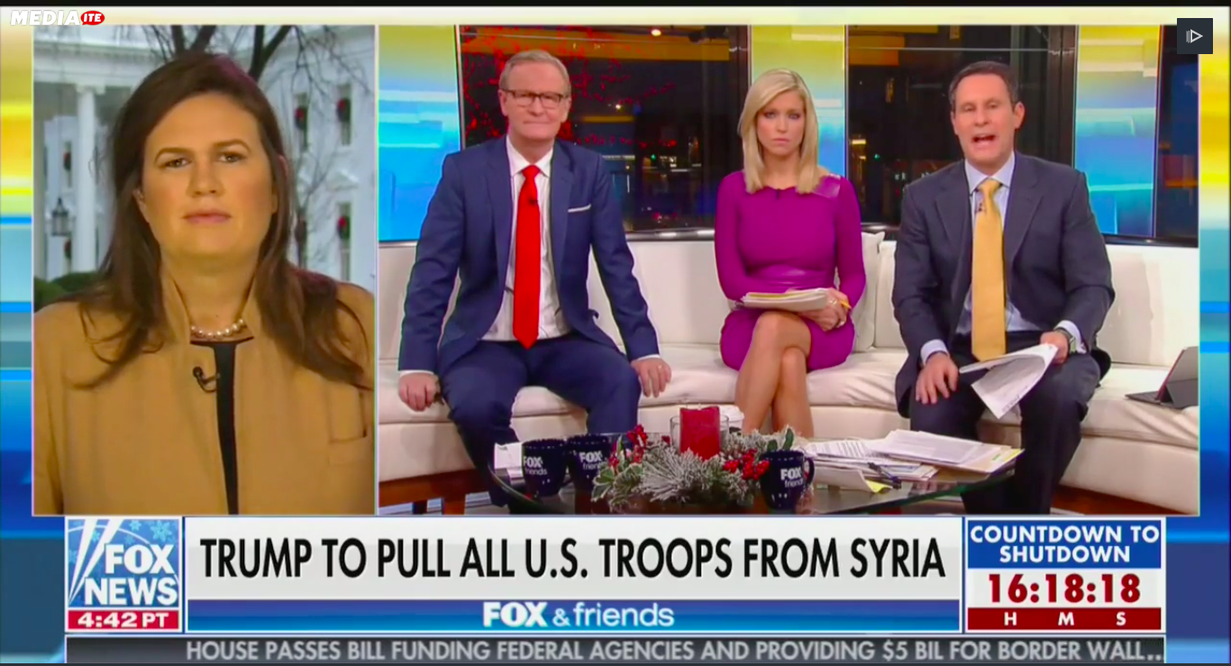 Instead of simply letting her push the administration's narrative, Fox News' Brian Kilmeade hammered Sanders for President Trump's recent decision to withdraw troops from Syria. Kilmeade, who has been fuming about this news all week, told Sanders that Trump is "doing exactly what he criticized President Obama for doing," pointing out that Trump said Barack Obama is the "founder of ISIS" because he pulled troops out of the Middle East. "He just refounded ISIS," Kilmeade said of Trump, not bothering to hide his rage or even ask Sanders a question.