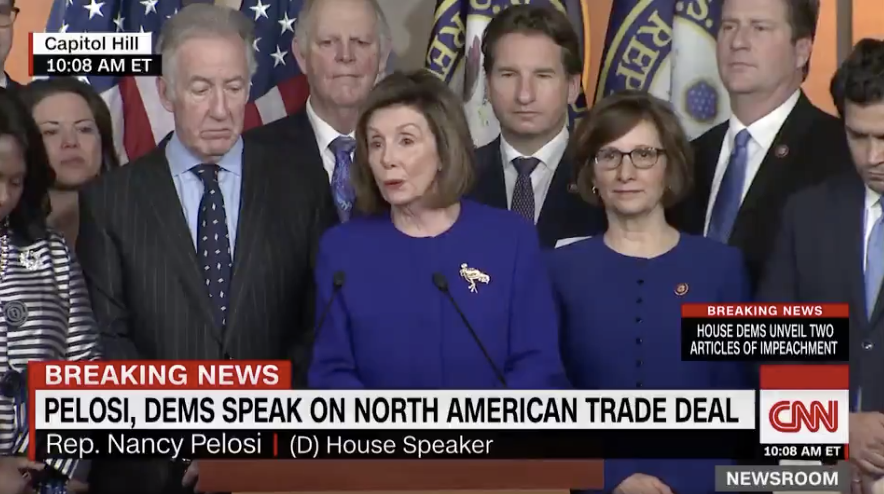 House Speaker Nancy Pelosi (D-Calif.) announced Tuesday that Democrats had reached a deal with the White House and were officially endorsing the USMCA trade deal. It would've been a glowing example of bipartisanship if Pelosi hadn't walked to this 10 a.m. press conference from one at 9 a.m. where she announced articles of impeachment against President Trump.