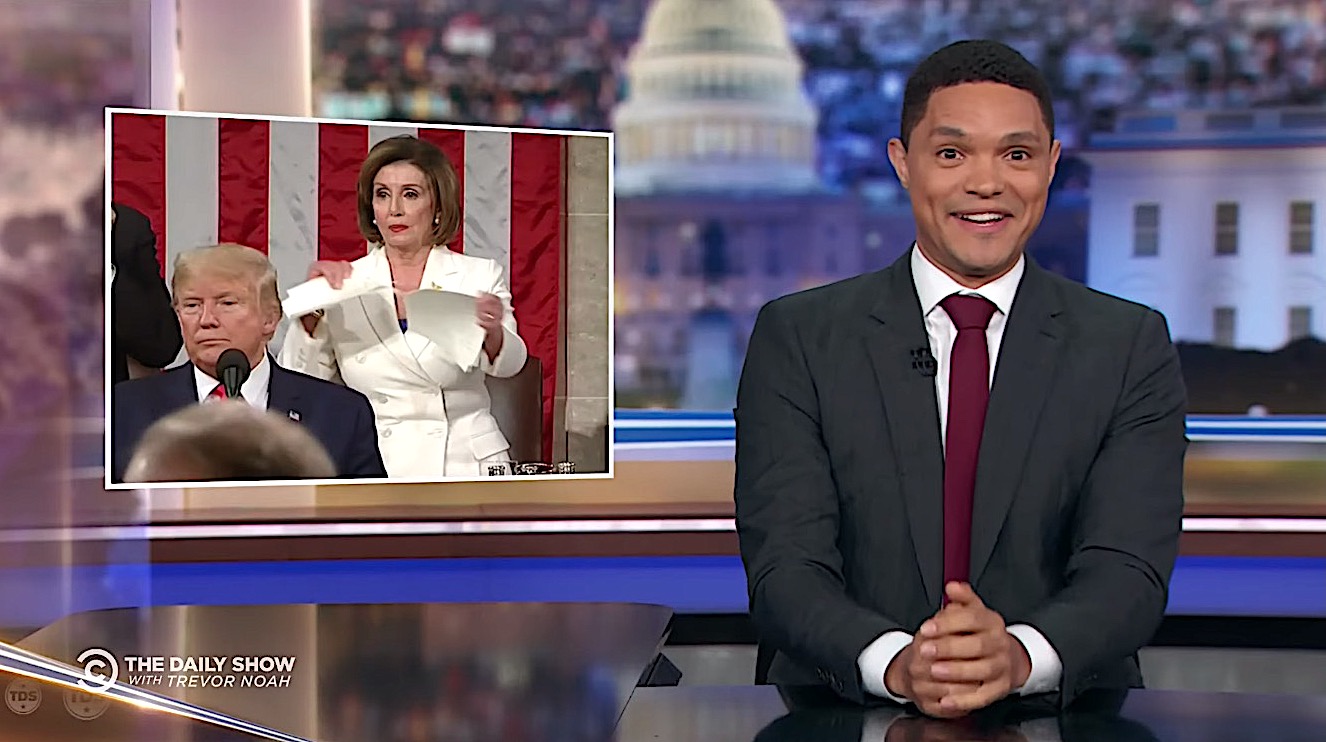 Still, the theme of the evening was "Trump doing what he does best: creating a show made for TV," Noah said. And "judging by the 212 standing ovations on the Republican side, they're loving their guy. But as for the Democrats, I think Nancy Pelosi's actions speak louder than words." He laughed at her ripping up Trump's speech: "Nancy Pelosi has done it again. I feel like every year she finds a new way to show Trump just how little she thinks of him and his speech." He recalled last year's sideways clap and predicted what Pelosi might do if Trump gets another State of the Union. Watch below. Peter Weber