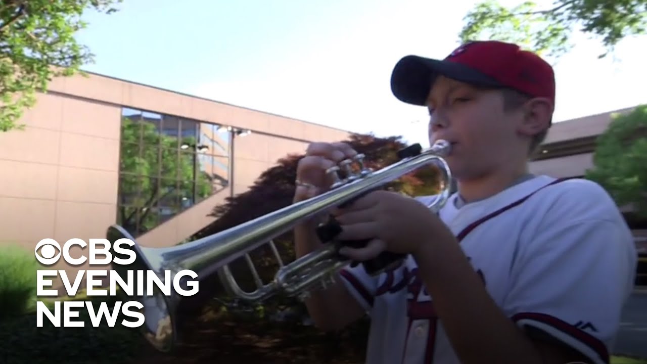 Every night, the 12-year-old trumpet player stands outside the hospital during shift change and puts on a mini-concert, performing songs like "Danny Boy," "America (My Country, 'Tis of Thee)," and "Somewhere Over the Rainbow." He was inspired by a New York Philharmonic trumpeter who stands on his balcony and plays in honor of health-care workers.