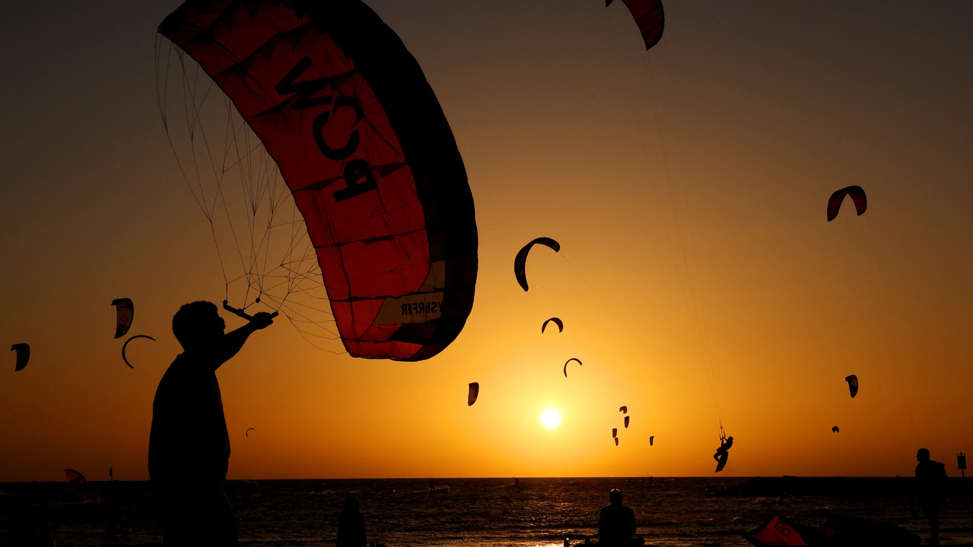 Kitesurfers show off their skills at sunset off a beach near Tel Aviv. Israel’s Mediterranean coast is a popular spot for the sport, a combination of surfing and paragliding.