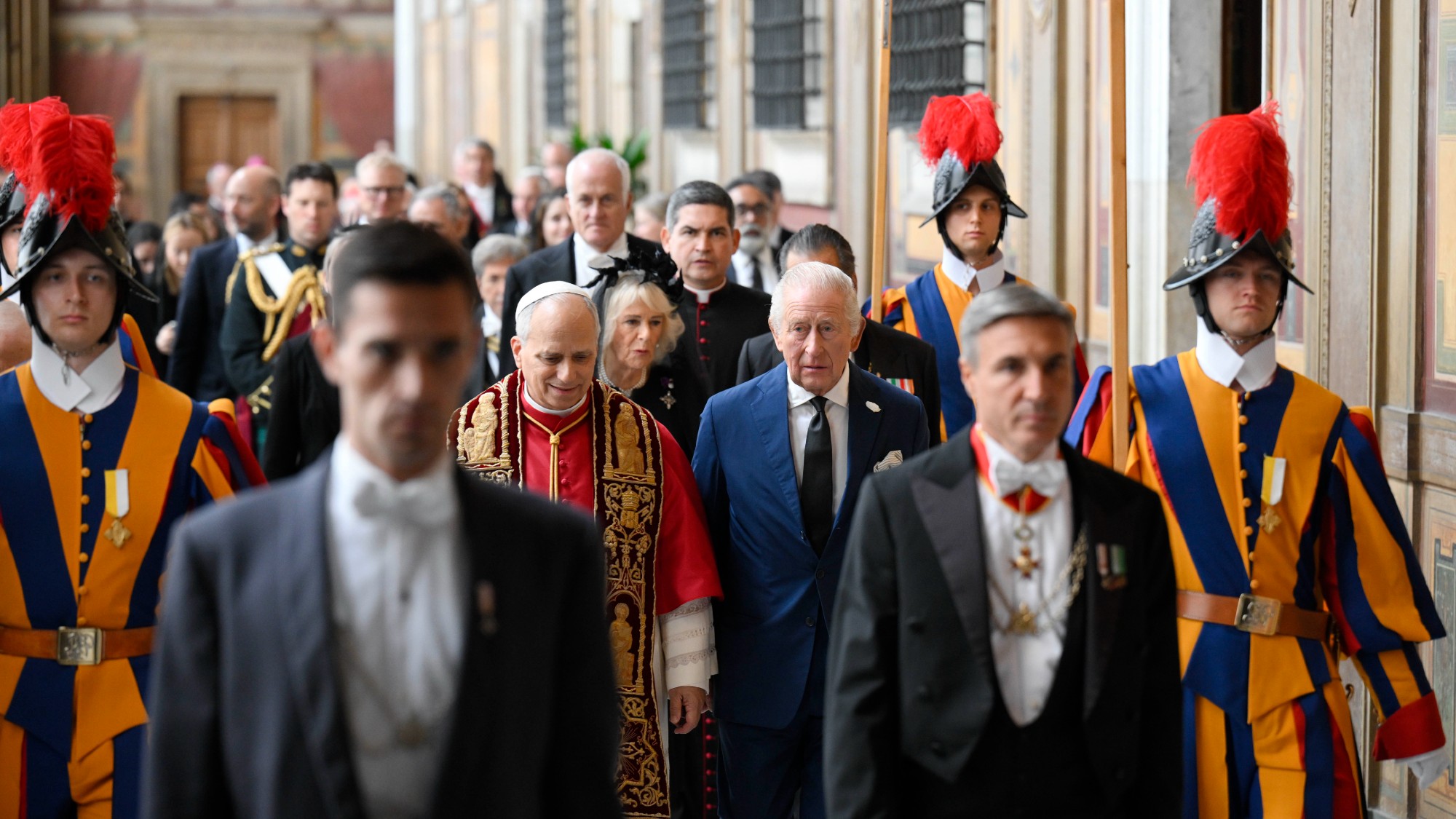 King Charles and Queen Camilla are led through the Apostolic Palace by Pope Leo XIV. At a service in the Sistine Chapel today, the King became the first English monarch to pray with a pope since Henry VIII broke from the Catholic Church almost 500 years ago.