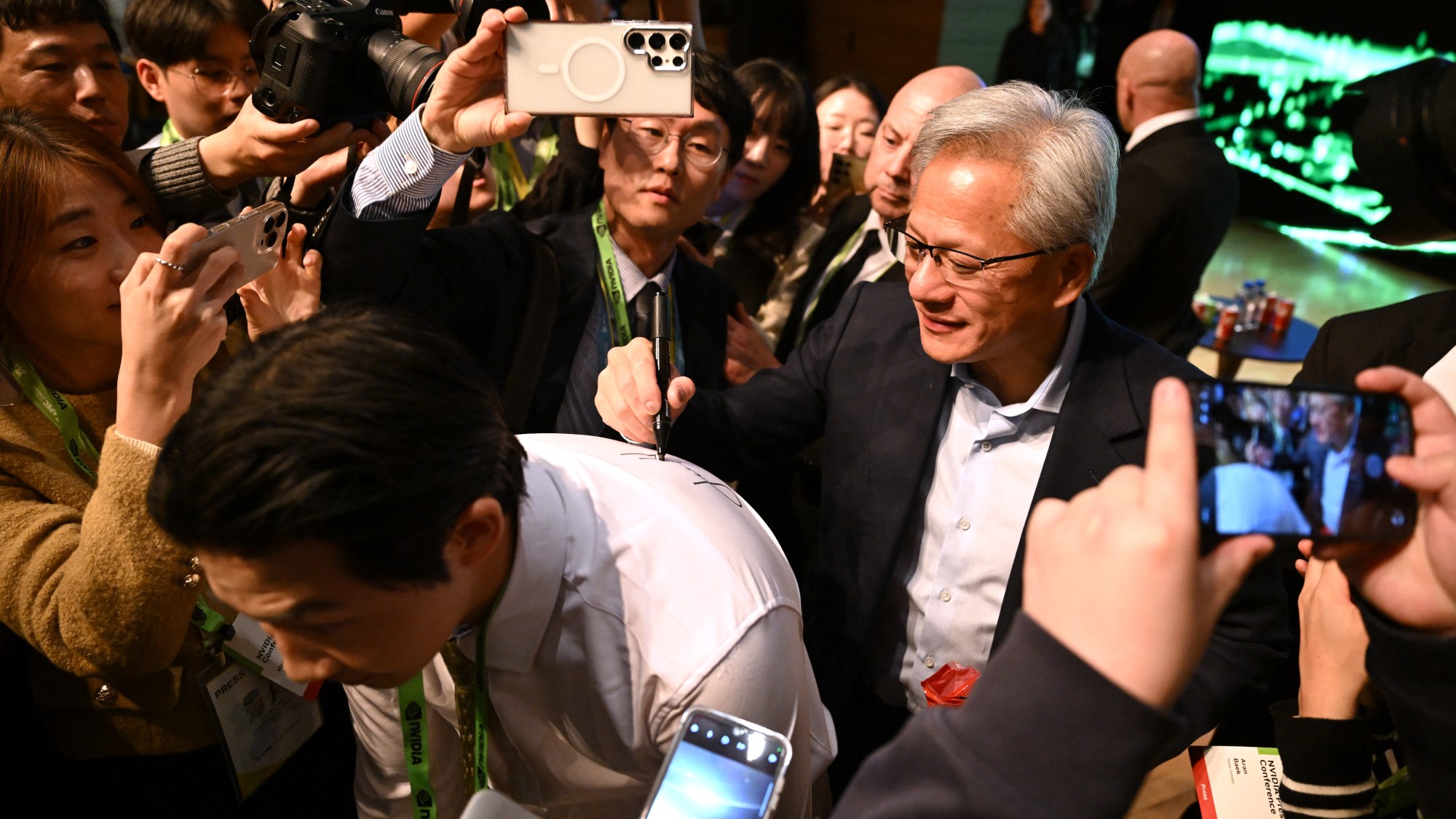 Nvidia founder and CEO Jensen Huang signs a reporter’s shirt outside today’s Asia-Pacific Economic Co-operation CEO Summit in Gyeongju. The Silicon Valley computer chip giant has just become the first company to reach a market value of $5 trillion.