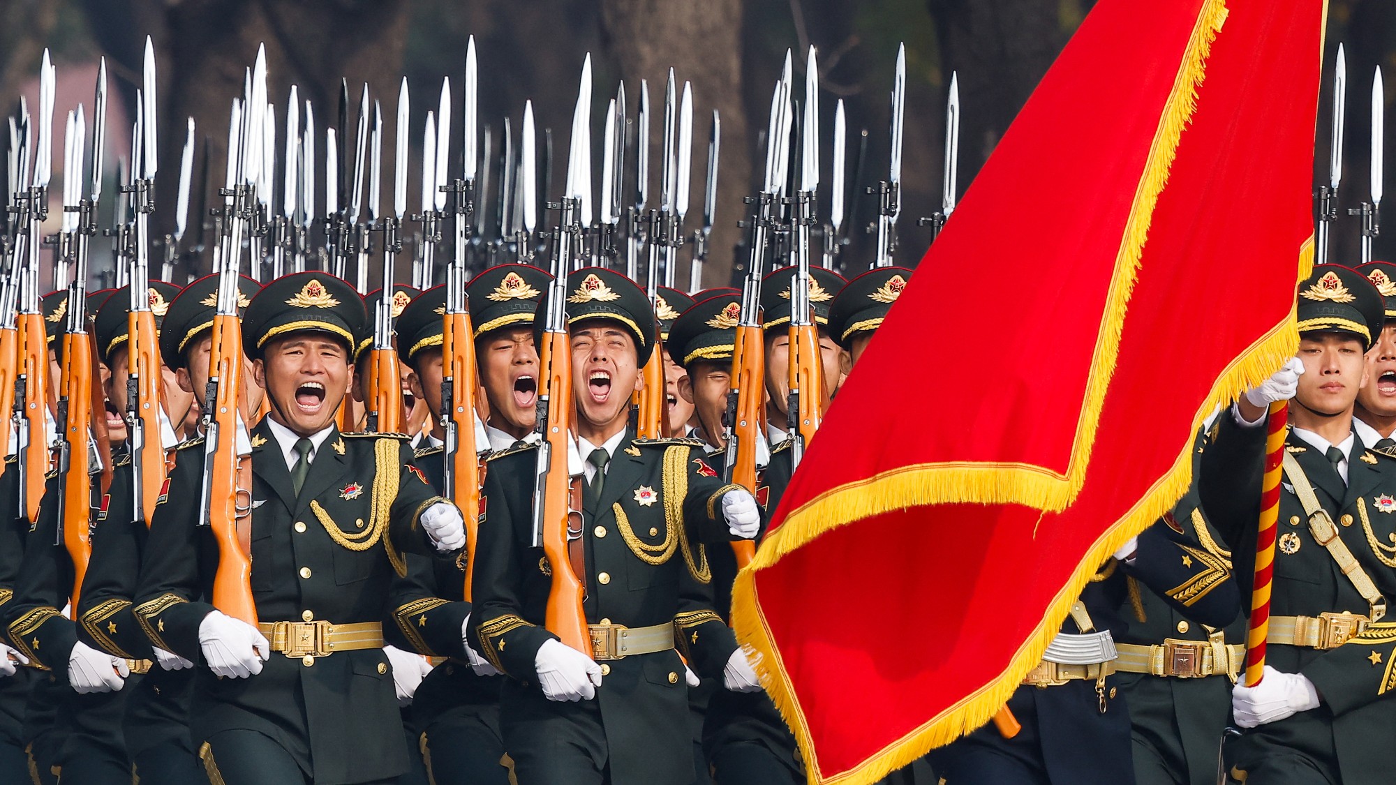 The Chinese People’s Liberation Army honour guard perform drills at a welcoming ceremony in Beijing for Spain’s King Felipe VI. The monarch is embarking on his first state visit to China since coming to the throne in 2014.