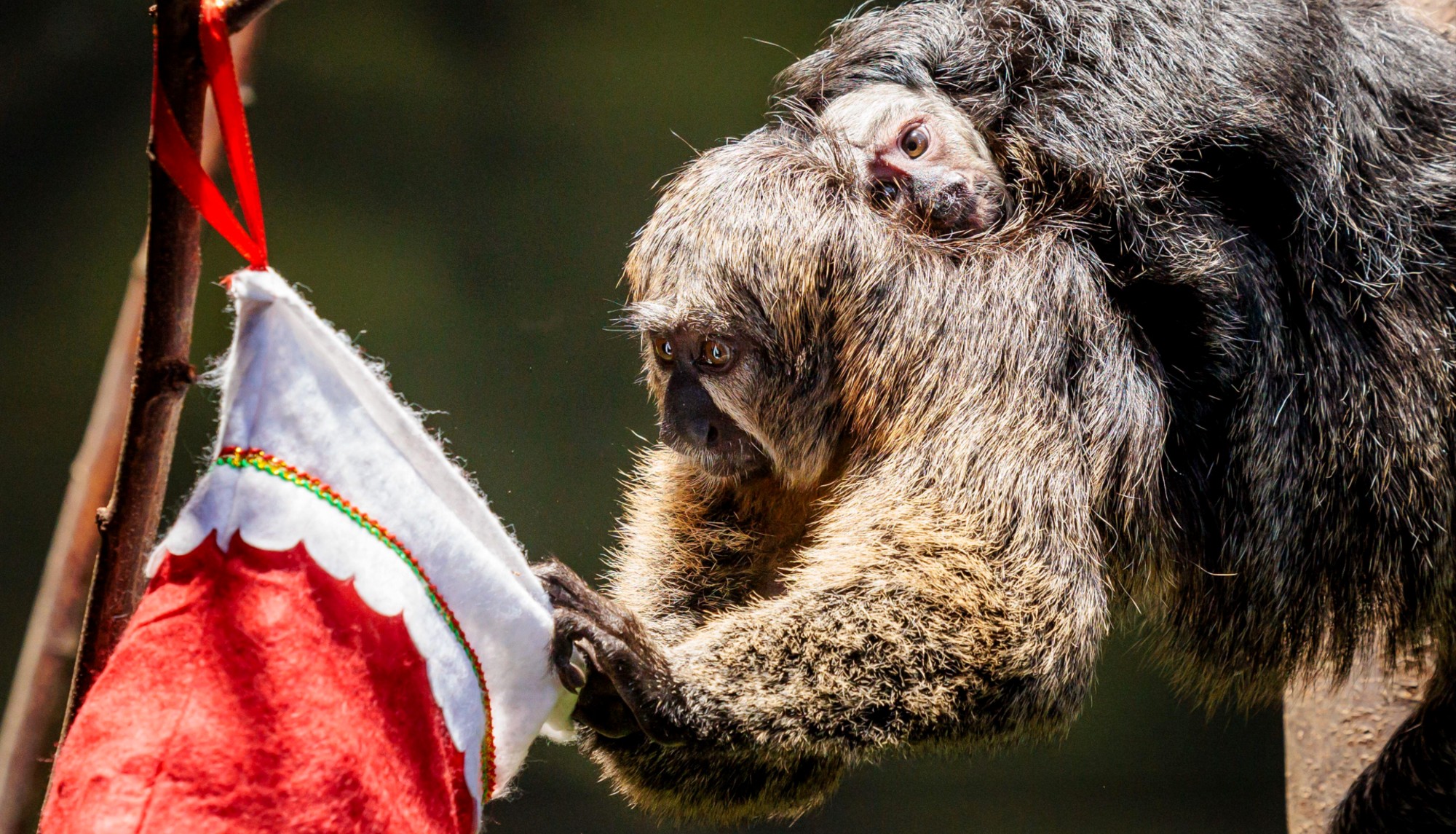 A saki monkey and her baby check out a stocking filled with festive treats from the zookeepers at ZSL London Zoo.