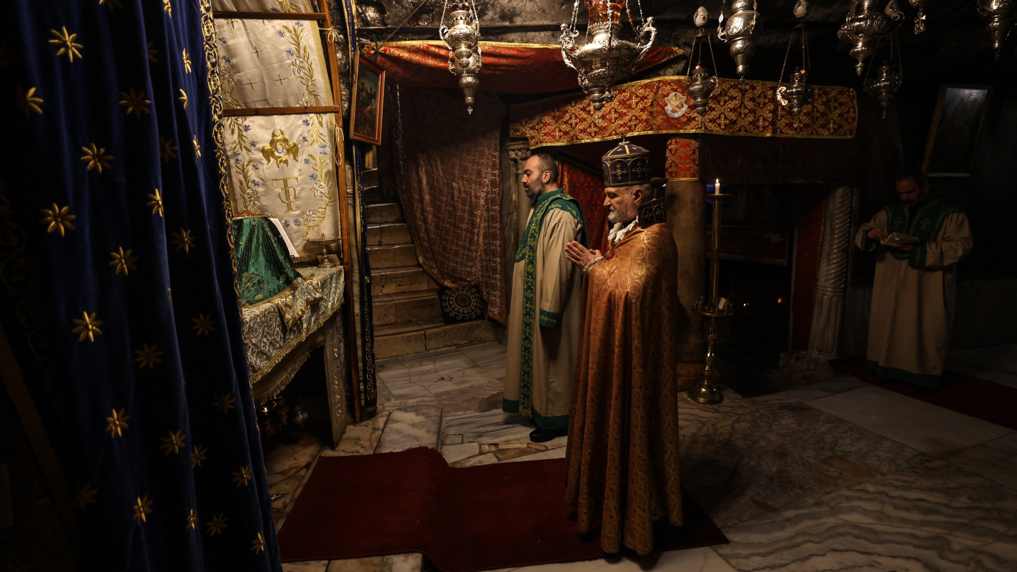 Members of the clergy pray in the grotto where Christ is believed to have been born beneath the Church of the Nativity in Bethlehem, in the Israeli-occupied West Bank. The Palestinian city is celebrating its first festive Christmas since the Gaza war began.