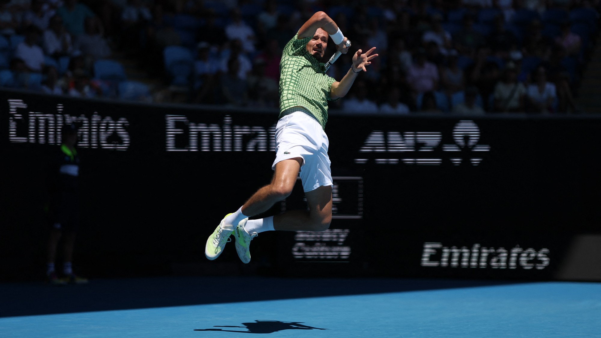 Russia’s Daniil Medvedev leaps into action to defeat the Netherlands’ Jesper De Jong in the first round of the Australian Open. The victorious former world No.1 is a three-time finalist at Melbourne Park but has never lifted the trophy.