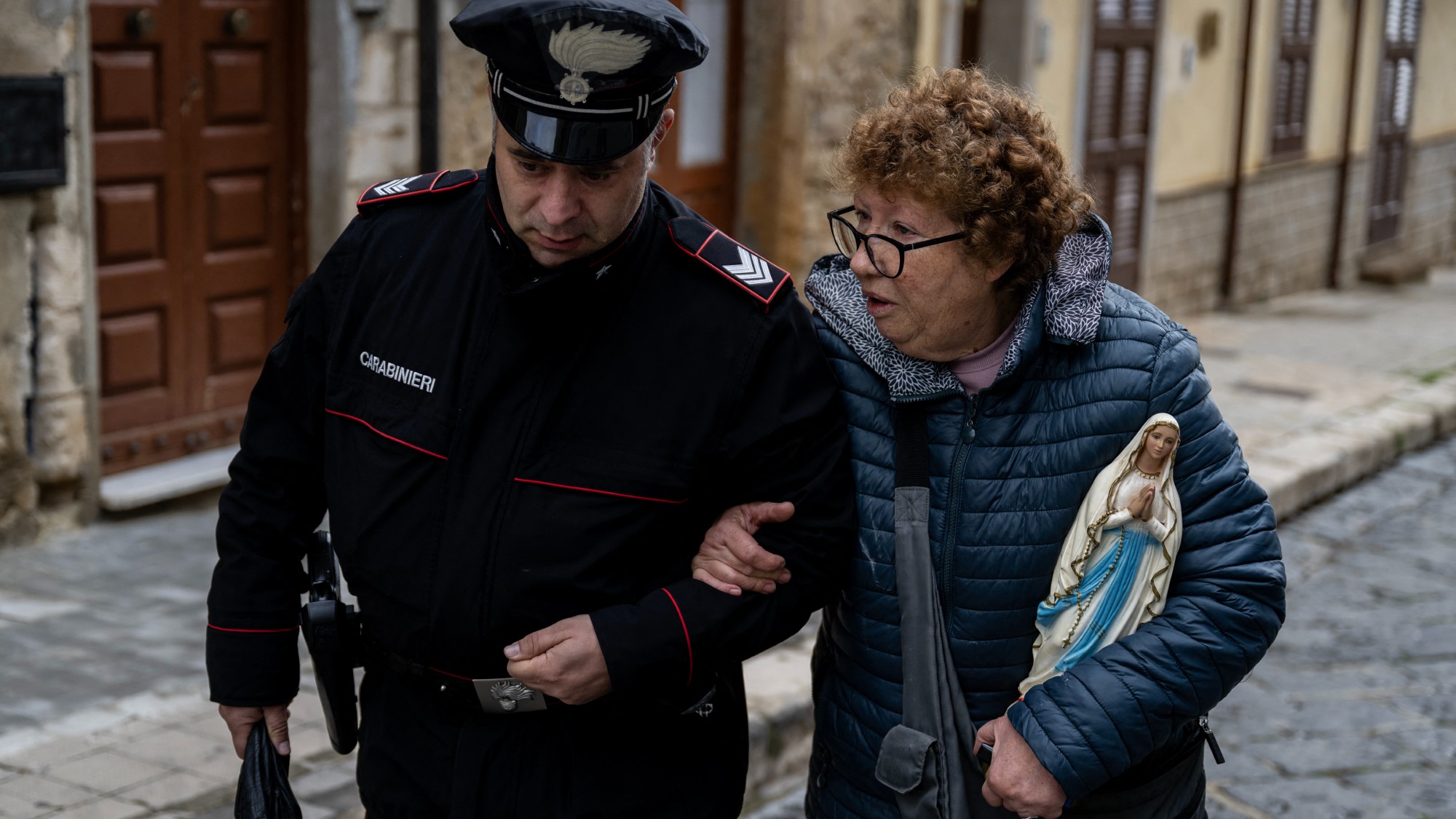 A Carabinieri officer escorts a woman as she collects belongings from her home in the “red zone” of the Sicilian town of Niscemi. Around 1,500 people have been forced to evacuate their homes in the hillside town, following a mammoth landslide triggered by severe weather.