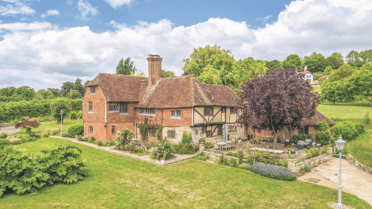 A remarkable Grade II house dating back to the 1500s and set in approx. 9 acres, including an orchard, woodland and kitchen garden. 5 beds, 5 baths, kitchen, 4 receps, 2-bed cottage, tennis court, garage. Was £2 million, now £1.75 million; Knight Frank.