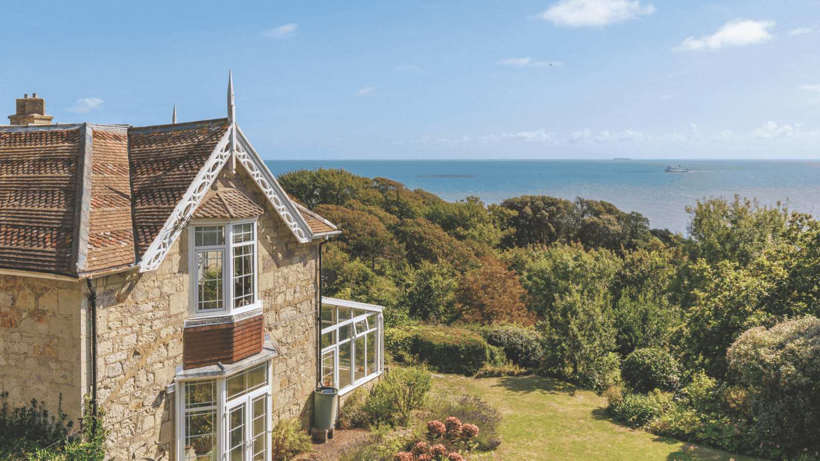 Part of a charming Victorian villa (the ground floor and part of the first floor), the house is surrounded by mature gardens and enjoys an elevated position with panoramic sea views. 3 beds, 2 baths, kitchen, 3 receps, garden, parking. £650,000; Spence Willard.