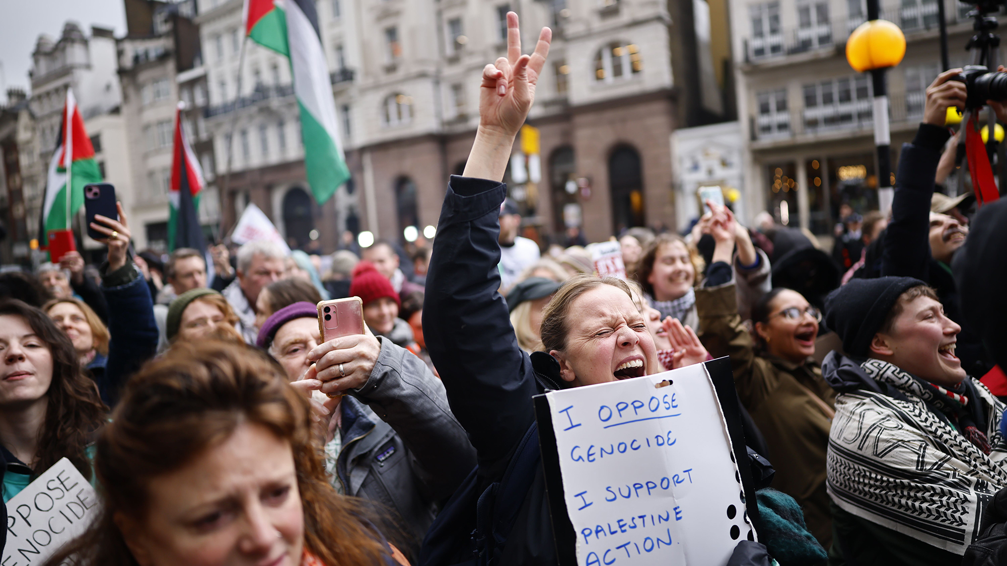 Crowds celebrate outside London’s High Court following a ruling that the government’s ban on Palestine Action was unlawful. The protest group’s co-founder Huda Ammori brought the challenge against last year’s anti-terror proscription, under which at least 2,700 people have been arrested.