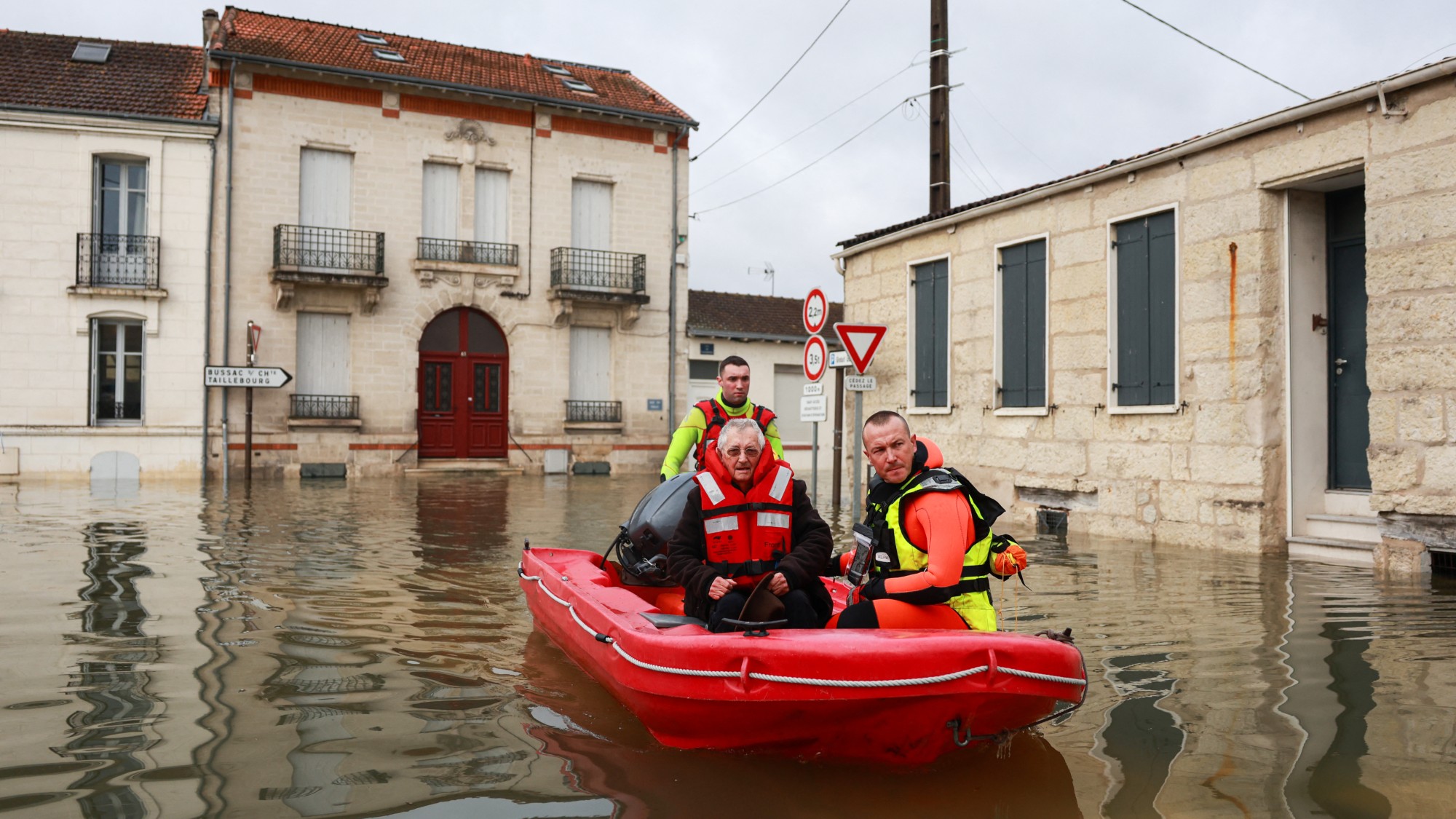 Rescuers navigate a flooded street in the French city of Saintes as the Charente River overflows following days of heavy rain. Four departments in western France remain on red alert for flooding as Storm Pedro batters Western Europe.