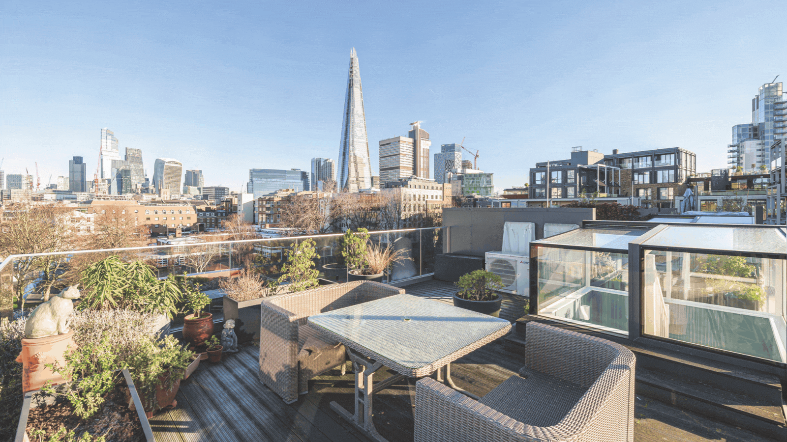 Modern townhouse with a private roof terrace that offers far-reaching views over the City of London skyline. The property is in an exceptional location close to Borough Market and the South Bank. 3 beds, 2 baths, kitchen, recep, study. £1.7 million; Dexters.