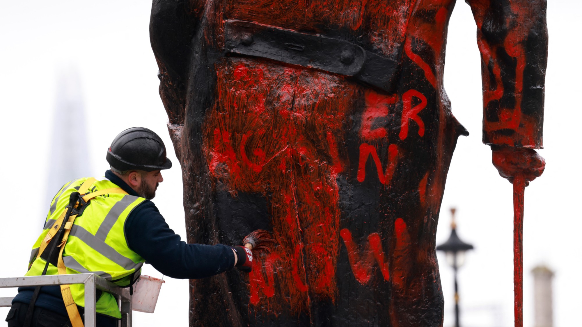A worker wipes graffiti from the statue of Winston Churchill in Parliament Square, central London. A 38-year-old man was arrested this morning on suspicion of racially aggravated criminal damage, after the former prime minister’s effigy was found sprayed with slogans such as “Zionist war criminal”.