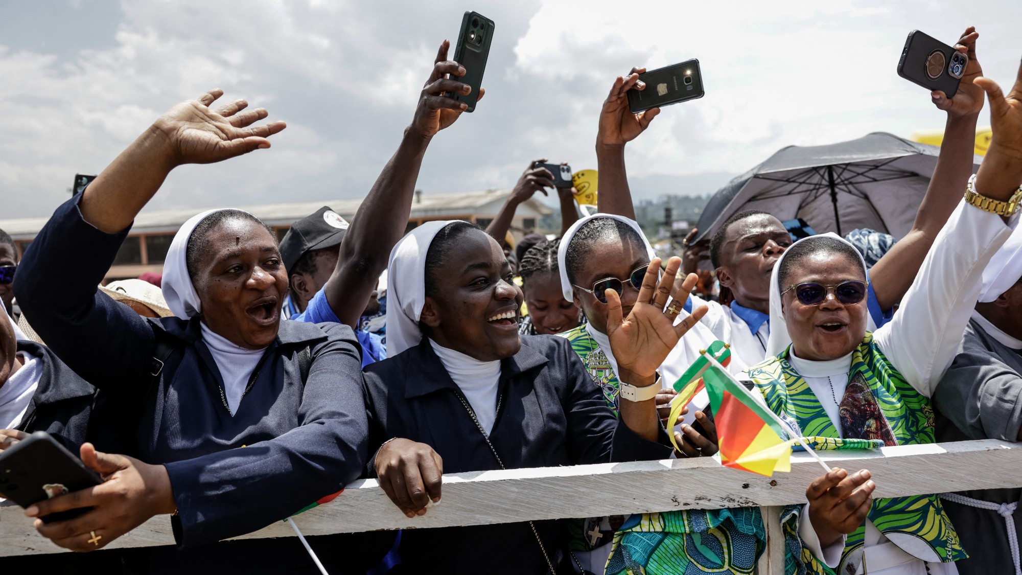 Religious sisters wave as Pope Leo XIV passes in the Popemobile en route to the cathedral in the Cameroonian city of Bamenda, during his 11-day visit to Africa. Cameroon is home to more than eight million Catholics.