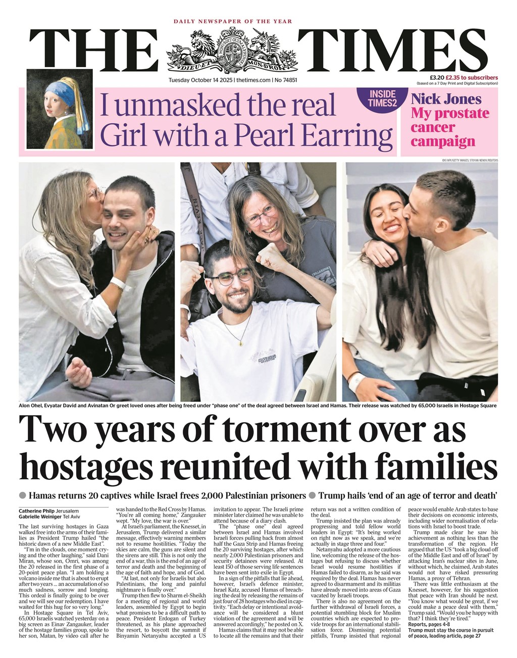 The torment is over after Israeli hostages were released yesterday, says The Times. It was the “day we thought we’d never see”, says The Mirror. There was a “hug of love” when the twin Israeli hostages Ziv and Gali Berman reunited, adds the Daily Star. Meanwhile, large crowds also gathered in Khan Younis for the return of nearly 1,700 Palestinians who had been detained without trial during the war. Donald Trump received several standing ovations in the Israeli parliament as he “set out a grand postwar vision”, says the Financial Times. The US president mentioned other peace deals he hopes to broker, including with Russia.