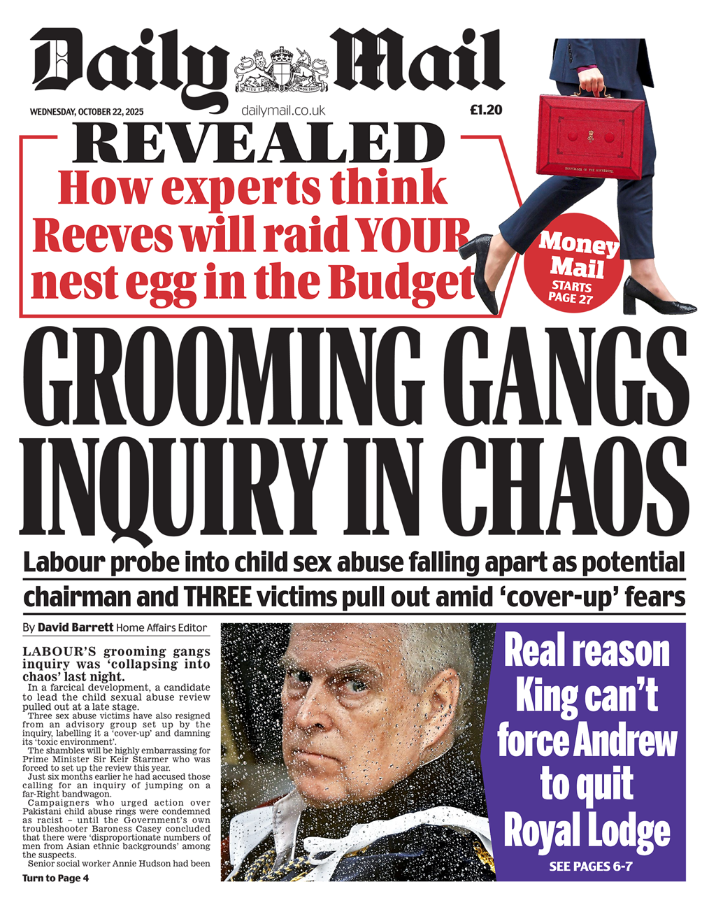 The grooming gang inquiry is “in chaos” after three abuse survivors resigned from the process, reports the Daily Mail. The withdrawal of one of the candidates, who was in the running to lead the review, is a “farcical development”, it says. Rachel Reeves believes that Brexit hit the economy “even harder than feared”, says The Independent. With “one month to go until the crunch Budget”, the UK is “rebuilding ties with Brussels”, it adds. Benefits are set to rise by 4% as “problems pile up” for the chancellor, says The i Paper, while The Times says the OBR will “downgrade” Britain’s growth forecasts.
