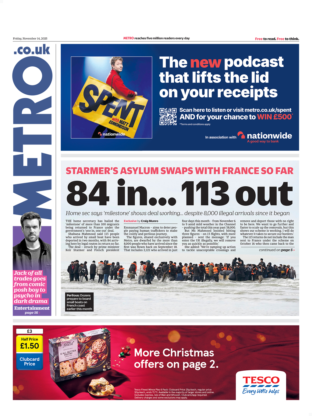 “84 in… 113 out”, says Metro, calculating the latest ratio in the government’s one-in-one-out strategy. It adds that figure is “dwarfed” by the more than 8,000 people who have arrived on small boats since the deal began. A second Trump clip was “doctored” by the BBC, reports The Telegraph, saying that Newsnight also misleadingly edited a Trump clip from the same speech, for a programme in 2022. There is a “call to arms”” in Germany, says the Financial Times, after Berlin announced that all 18-year-old German men must have medical inspections to see if they are fit enough to serve in the military.